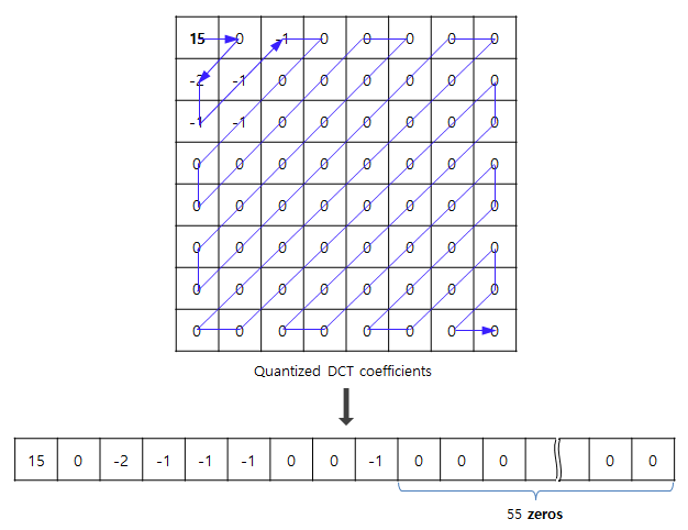 모든 블록이 양자화 과정까지 마쳤다면 이 양자화된 DCT 계수들을 압축하기 위한 단계가 남아있다.