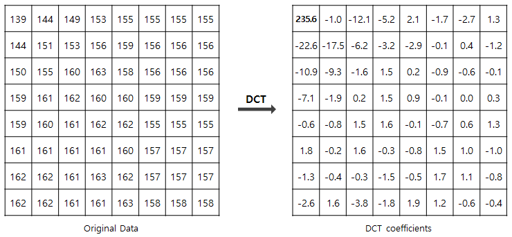 각각의 8x8 블럭에 DCT 변환을 수행하면 공간 영역(Spatial Domain)에서 주파수 영역(Frequency Domain)으로 변하며 좌측 상단에 저주파 성분이 배치되고, 우측 하단에 고주파 성분이 배치된다.