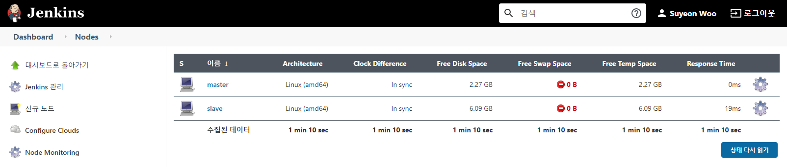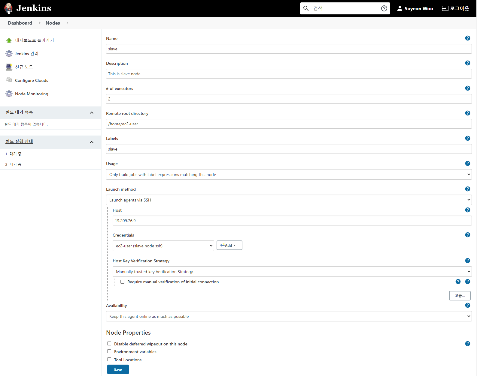 slave 노드에는 별도로 Jenkins를 설치하지 않고 ssh 통신으로 master 노드가 slave 노드에 작업을 지시하도록 할 것이다.