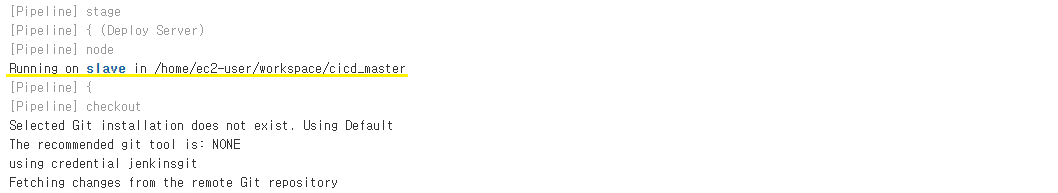 log를 봐도 'Deploy Server' Stage가 slvae 노드에서 빌드되었음을 확인할 수 있다.