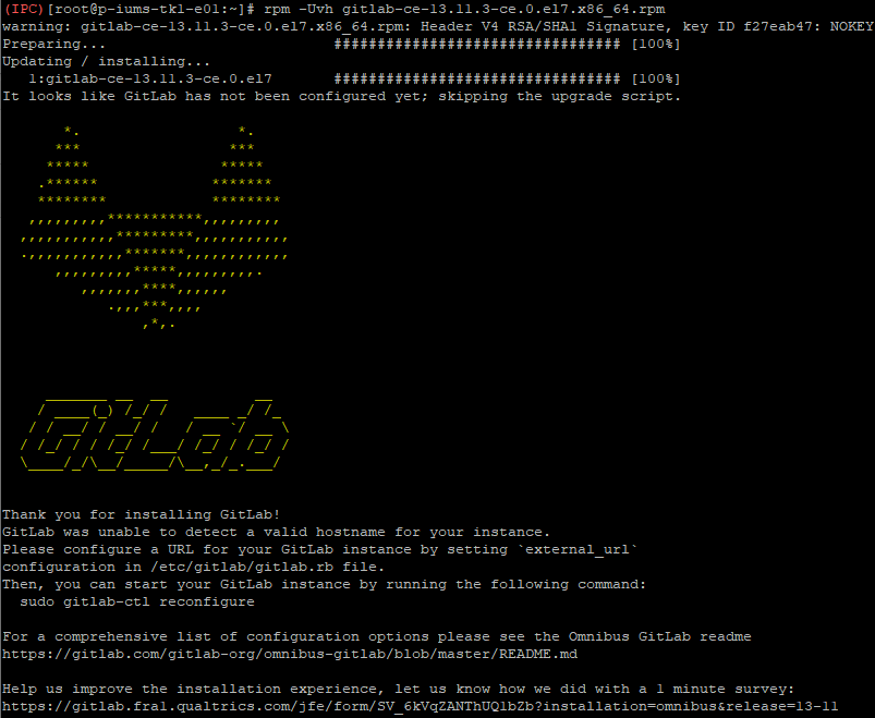 $ rpm -Uvh gitlab-ce-13.11.3-ce.0.el7.x86_64.rpm