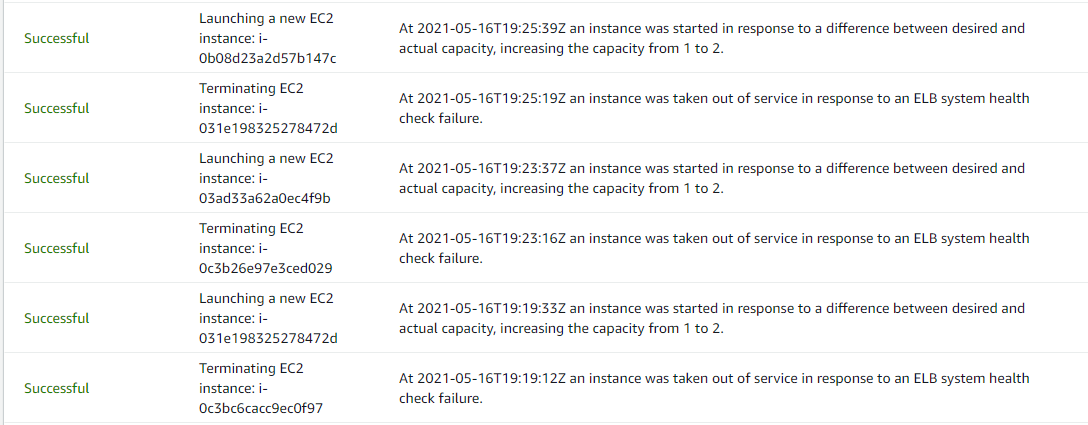 아까 Auto Scaling Group 생성 시 Health Check Type에 ELB를 체크하였기 때문에 unhealthy 상태의 인스턴스를 삭제하고 새로 생성하는 작업을 반복한다.