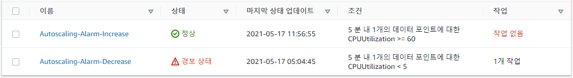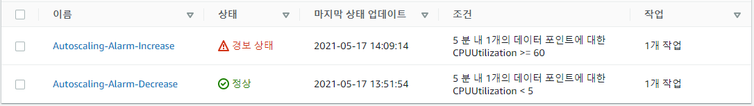 현재 Auto Scaling Group에는 아래와 같이 2개의 조정정책이 설정되어 있다.