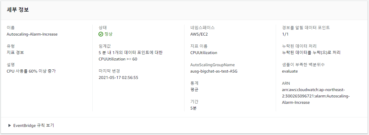 Scale-out 테스트를 위해 CloudWatch에서 CPU 사용률이 60% 이상이 되면 발생하는 경보를 추가하였다.