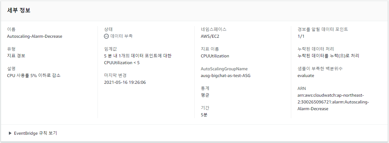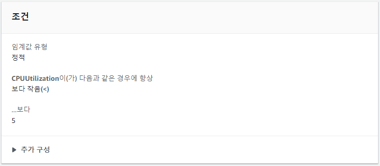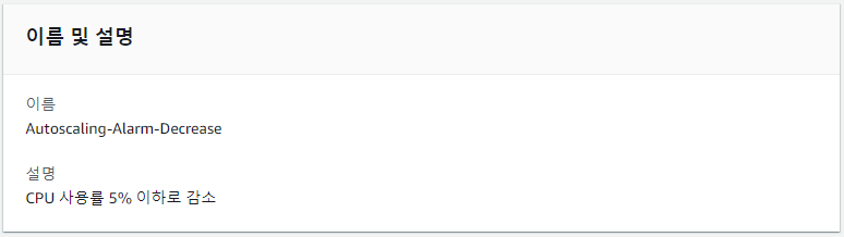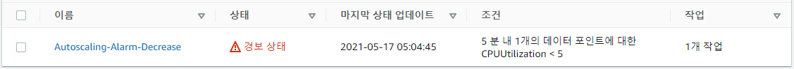 Auto Scaling Group의 CPU 사용률이 5% 이하면 경보가 발생하도록 설정하였다.