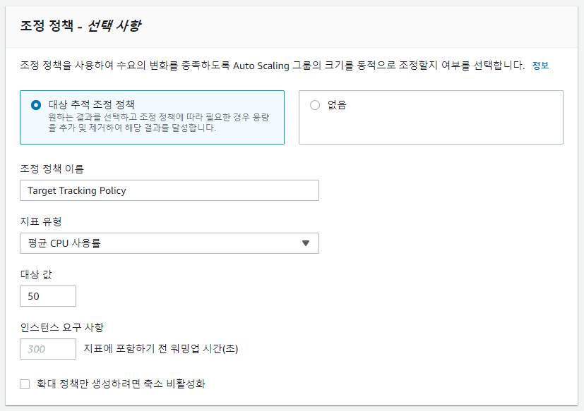 - Min Size : 오토스케일링 그룹의 최소 유지 서버 수 (Desired > = MinSize)