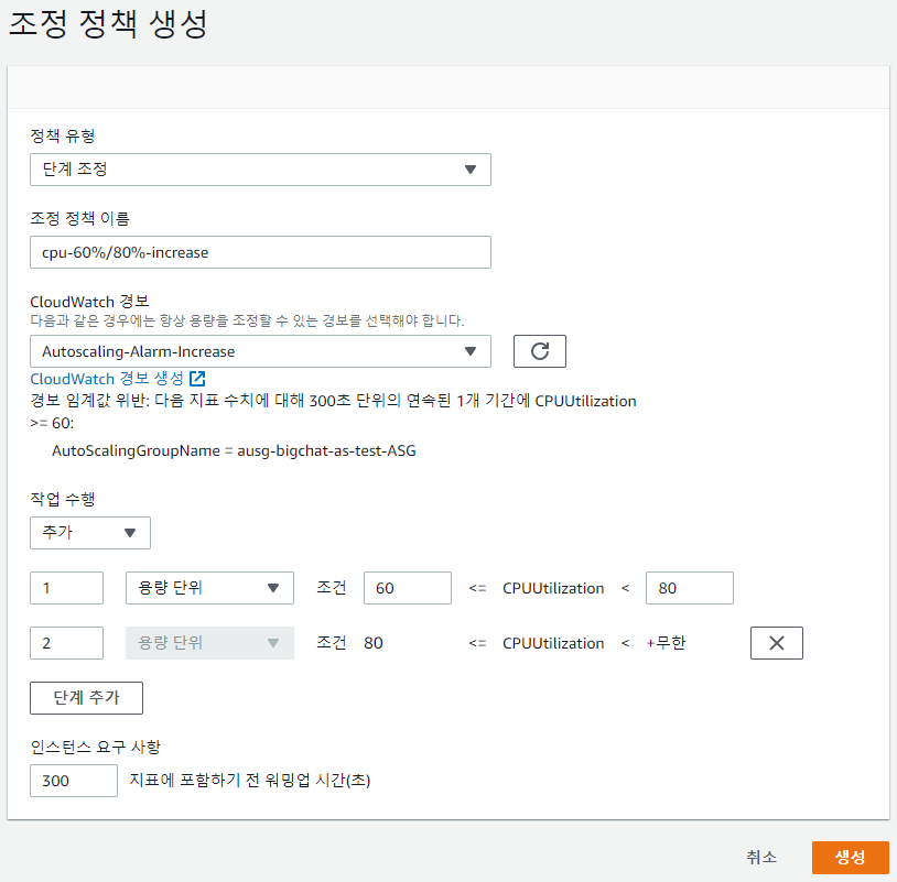CPU 사용률이 60%~80%이면 1개의 인스턴스를 증가시키고, 80% 이상이면 2개의 인스턴스를 증가시킨다.