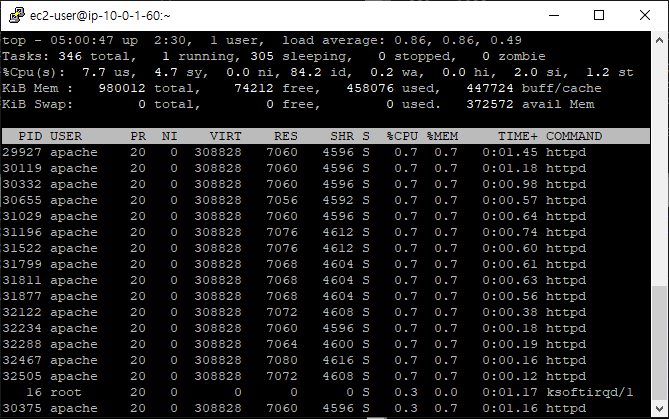 top 명령어로 확인해보면 CPU 사용률이 100%까지 올라간 것을 확인할 수 있다.