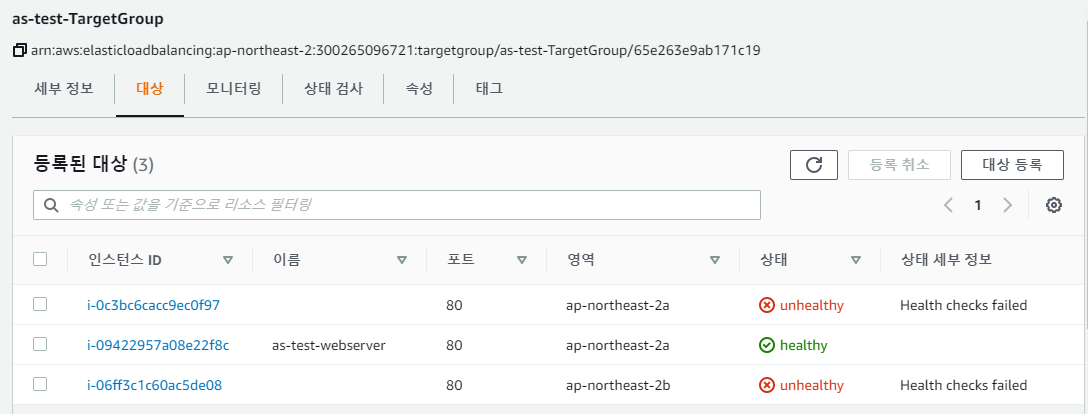 현재 Scale-out 된 인스턴스들에 웹서버 설치가 되지 않아 unhealthy 상태로 체크된다.
