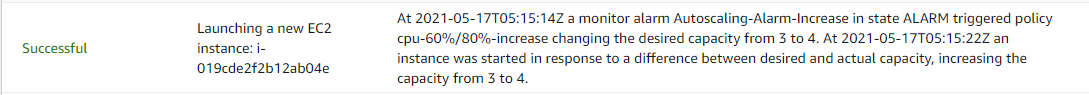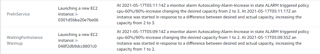지정해놓은 300초(5분)가 지나자 아직 경보가 해제되지 않았기 때문에 인스턴스가 1대 더 Scale out 되는 것을 확인할 수 있다.