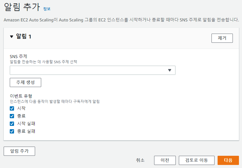 우선 단계 조정정책 또는 단순 조정정책을 생성하기 위해 CloudWatch 경보를 생성해야 한다.