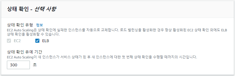 Elastic Load Balancing(ELB) 상태 확인을 활성화하면 연결된 로드 밸런서가 Amazon EC2 상태 확인에 실패할 때뿐만 아니라 비정상으로 보고할 때 Amazon EC2 Auto Scaling에서 인스턴스를 교체할 수 있다.