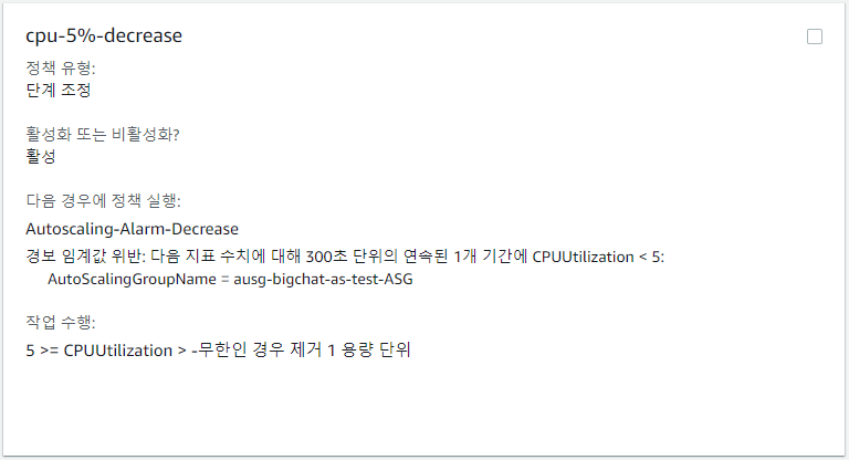 해당 경보를 이용하여 경보가 발생하면 인스턴스가 1개 Scale-In 되도록 단계 조정정책을 추가하였다.