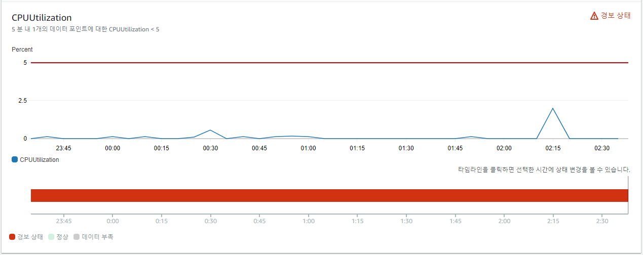당연히 아무것도 하지 않기 때문에 CPU는 5% 이하가 유지되고 있었으며, 경보가 발생한 상태이다.