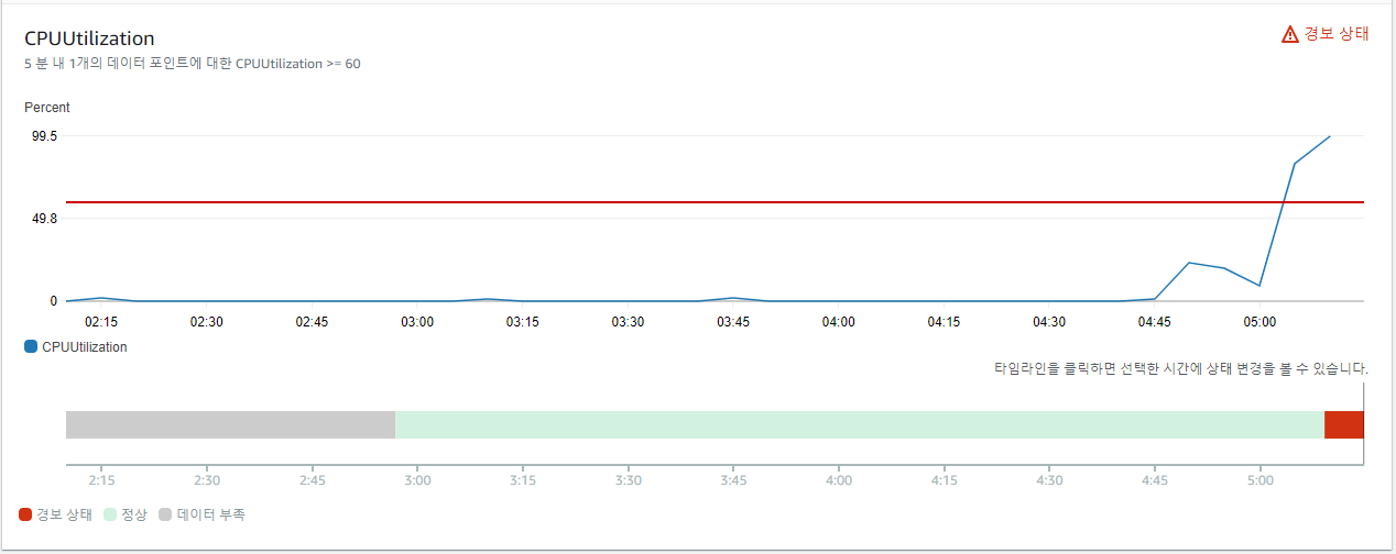 CloudWatch에서 5% 이하 경보는 해제되고 60% 이상 경보가 발생한다.